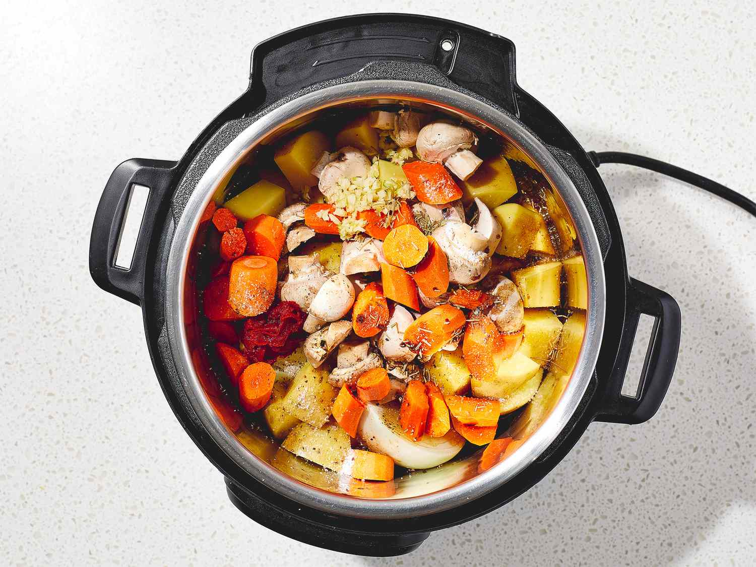 - Step 3:Return all beef chuck cubes to the pot. Add potatoes, mushrooms, onion, carrots, and garlic; cover with beef broth. Stir in Worcestershire sauce, tomato paste, salt, pepper, and rosemary. Dotdash Meredith Food Studios