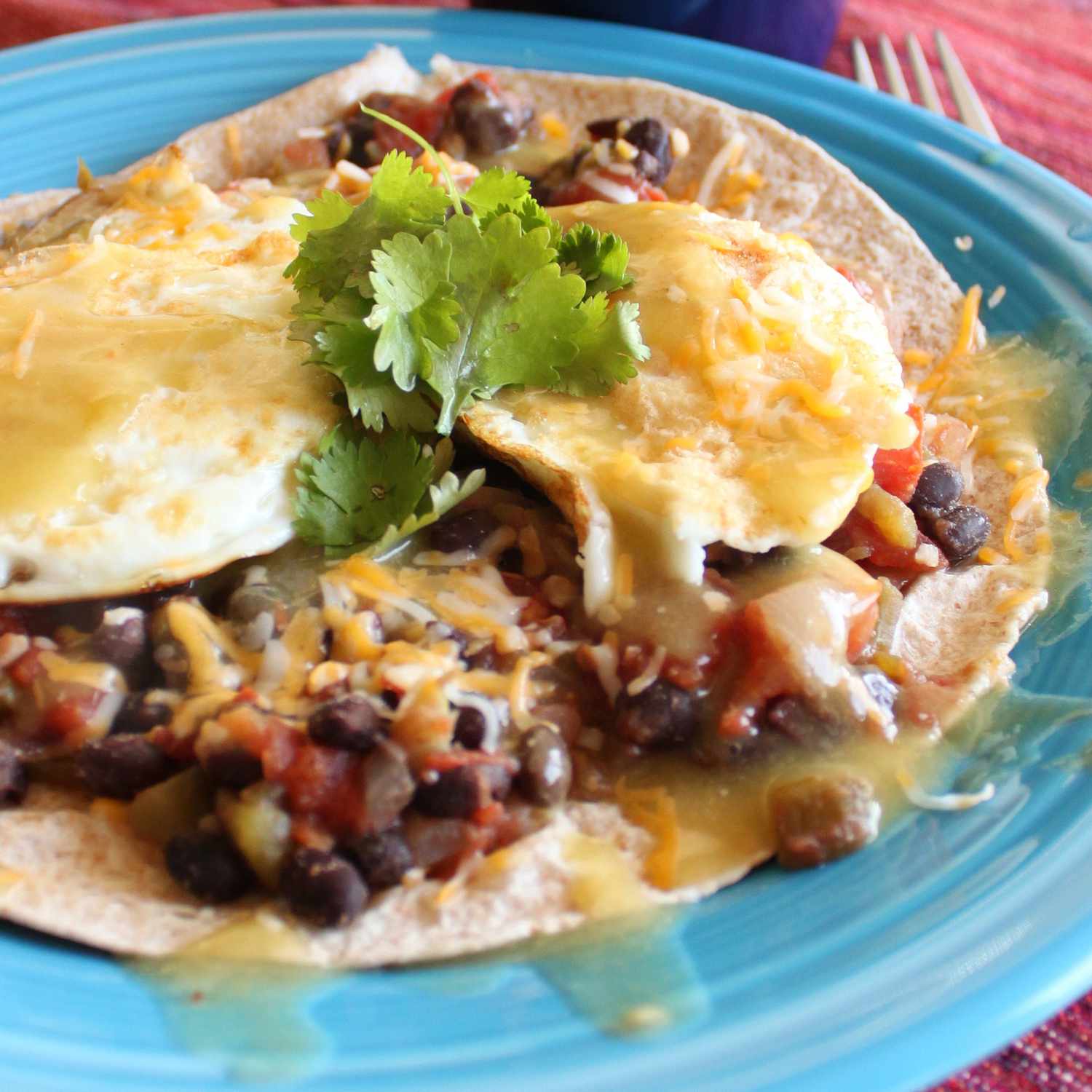 Delicious Huevos Rancheros with black beans.