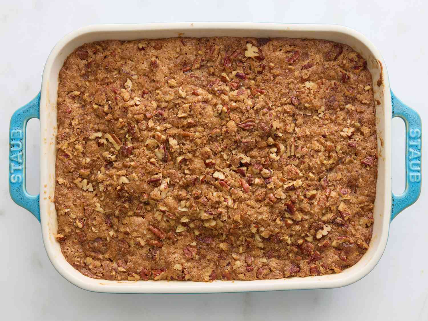 - Step 6:Spread 1/2 of the batter over the bottom of the prepared baking dish, then sprinkle with 1/2 of the topping. Carefully spoon remaining batter over topping, then sprinkle with remaining topping; very gently press topping into batter. Dotdash Meredith Food Studios