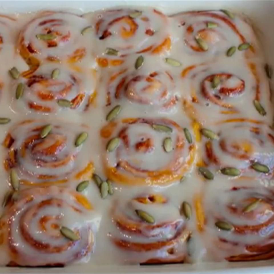 - Step 11:Whisk cream cheese, confectioners' sugar, milk, and vanilla extract together in a large bowl until smooth; drizzle over the warm cinnamon rolls. Sprinkle pumpkin seeds over the rolls to serve.